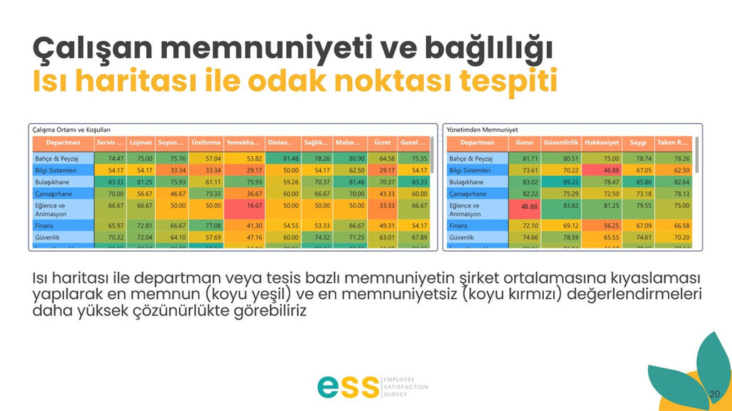 Çalışan memnuniyetini ve bağlılığını ölçerek otellerin iç işleyişini ve çalışan memnuniyetini artırmaya yönelik analiz sağlar. Özellikle çalışan bağlılığı, yönetici memnuniyeti ve iş ortamı analizi gibi unsurlar içerir.